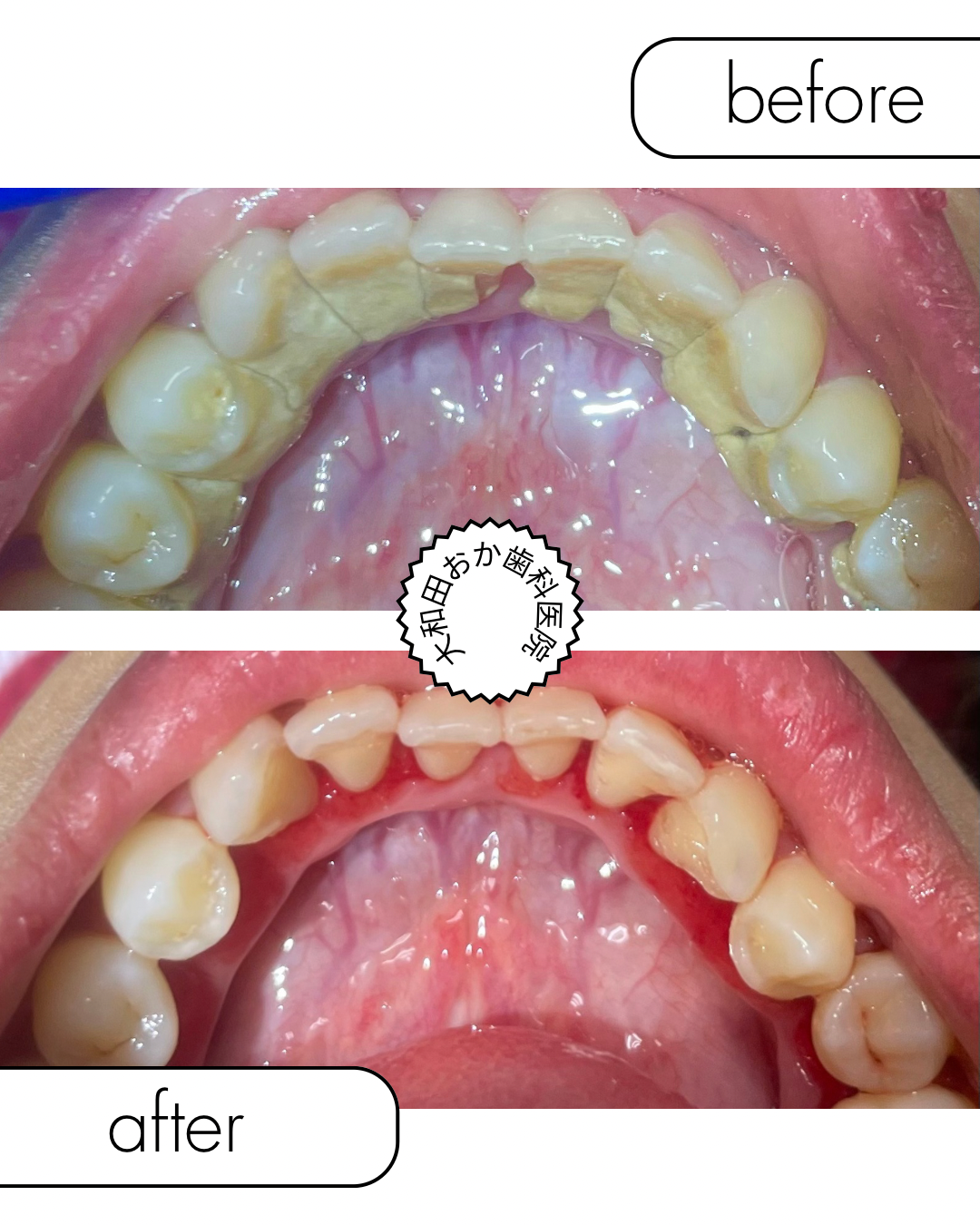 歯の裏側に付着した黄色い歯石を除去した症例です。